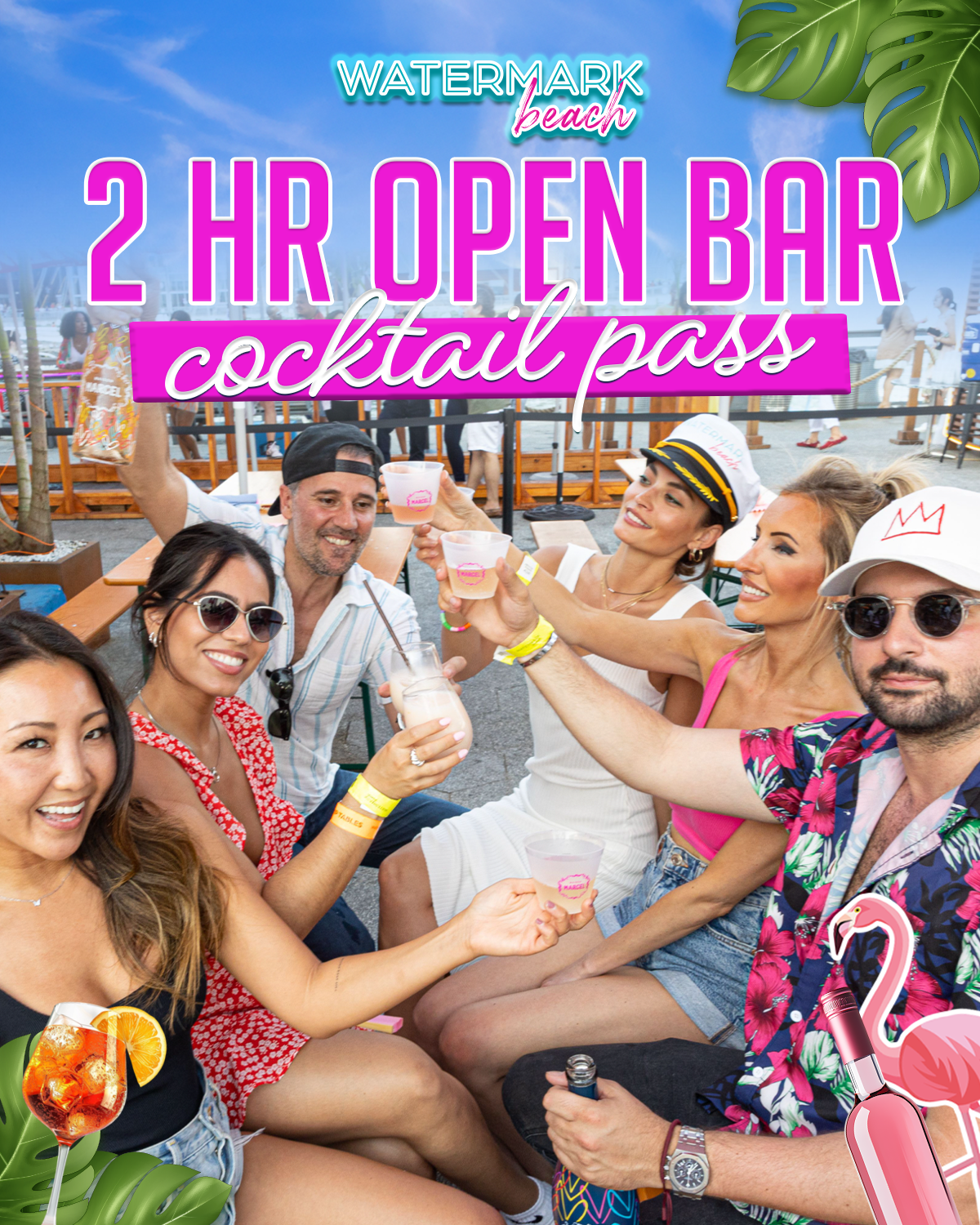 Grab your booze squad & experience Watermark Beach NYC, a waterfront oasis at Pier 15 NYC, surrounded by palm trees, photo moments, an outdoor bar, games, and more!